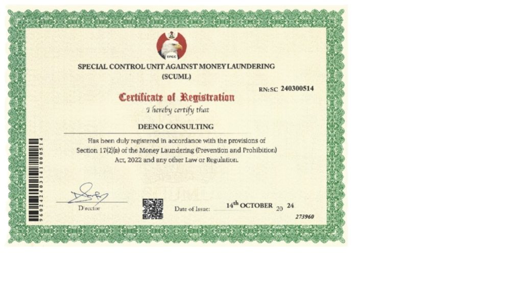 Section 17(2)(a) of Nigeria’s Money Laundering (Prohibition) Act (MLPA) generally refers to the requirement for Designated Non-Financial Businesses and Professions (DNFBP) to register and get certified by the Special Control Unit against Money Laundering (SCUML) to comply with anti-money laundering laws, ensuring they implement customer due diligence (CDD) and report suspicious activities. This section mandates that these businesses (like accountants,consultants,lawyers, real estate agents, luxury dealers.Etc.) identify customers and monitor transactions, especially high-value ones, to prevent financial crimes.